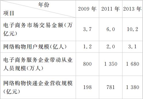 材料 下表为2009年、2011年、2013年我国电子商务发展的相关数据统计表。