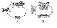 【解析】答案D。本题考查的是昆虫的生殖和发育。昆虫为体内受精,有性生殖。昆虫的外骨骼不能随身体的生长而生长,因而在发育过程中有蜕皮现象。A图昆虫的发育过程经历了卵、若虫、成虫三个时期,若虫与成虫在形态和生活习性方面相似,这种发育为不完全变态,其危害农作物的时期是成虫。B图昆虫的发育过程经历了卵、幼虫、蛹、成虫四个时期,幼虫与成虫在形态和生活习性方面差别很大,这种发育为完全变态,其危害农作物的时期是幼虫。