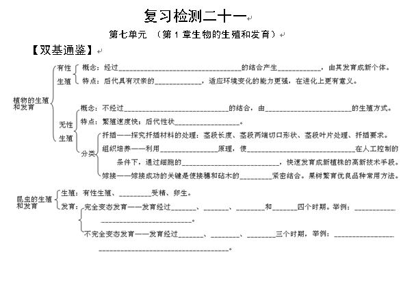 2.无性生殖:不经过两性细胞的结合,由母体直接产生新个体的生殖方式。组织培养、嫁接、扦插等均属于无性生殖。