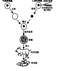 66.(7分)2006年12月22日,中国培育出的首例绿色荧光转基因克隆猪在东北农业大学顺利降生,下图为研究人员繁殖荧光猪的过程示意,请分析回答: