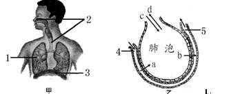 (4)甲图中[3]处于_____________状态时,乙图所示的外界气体按照c方向进人肺泡。