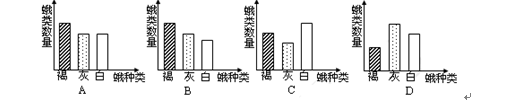 56.某地有一大型的石灰厂,其白色的粉尘使周围的植物都变成了灰白色。如果该厂长期生产,请你推测,该厂周围环境中不同颜色的蛾类最可能的变化结果是下图中的( )
