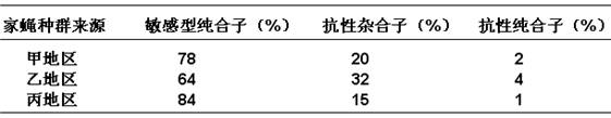 27.家蝇对拟除虫菊酯类杀虫剂产生抗性,原因是神经细胞膜上某通道蛋白中的一个亮氨酸替换为苯丙氨酸。下表是对某市不同地区家蝇种群的敏感性和抗性基因型频率调查分析的结果。下列叙述正确的是()