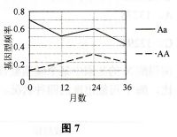 31.某种群中有AA、Aa、aa三种基因型的个体,其中AA、Aa所占比例随时间的变化如图7,第36个月时,基因a在种群中的频率为D