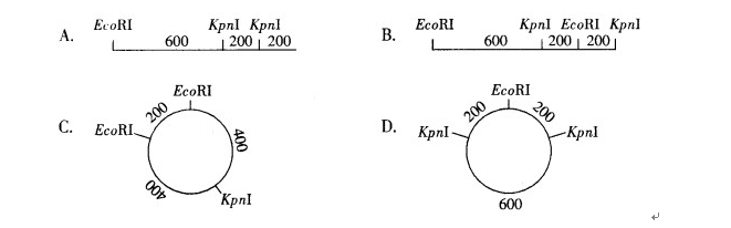 3.3 (广东生物)7.现有一长度为1000碱基对(by)的DNA分子,用限制性核酸内切酶Eco R1酶切后得到的DNA分子仍是1000 by,用Kpn1单独酶切得到400 by和600 by两种长度的DNA分子,用EcoRI、Kpnl同时酶切后得到200 by和600 by两种长度的DNA分子。该DNA分子的酶切图谱正确的是
