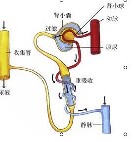 尿的形成包括肾小球和肾小囊壁的滤过和肾小管的重吸收。肾小球的结构类似一个滤过器。血液由入球小动脉流入肾小球时,除了血细胞和大分子蛋白质外,其余一切水溶性物质(如:一部分水、无机盐、葡萄糖、尿素等),都可以经过肾小球过滤到肾小囊内,形成原尿,人每天形成的原尿大约有150升。原尿中除了没有大分子蛋白质外,其它成分都与血浆几乎相同。原尿由肾小囊流入肾小管时,其中对人体有用的物质,如:大部分水、部分无机盐、全部葡萄糖,被肾小管重吸收进入包绕在肾小管周围的毛细血管中,而剩下的水、无机盐、尿素等就形成了尿液。综上所述,尿的形成可表示如下:血液→肾动脉→入球小动脉→肾小球→肾小囊(原尿)→肾小管→尿液