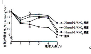 (2)图中结果显示,淹水时KNO对甜樱桃根有氧呼吸速率降低有作用,其中mmol·L的KNO溶液作用效果最好。