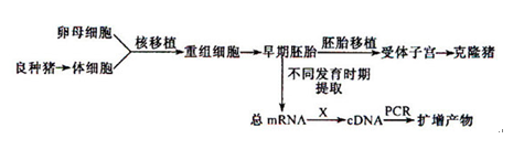 (1)图中重组细胞的细胞核来自细胞,早期胚胎移入受体子宫继续发育,经桑椹胚、囊胚和胚最终发育为克隆猪。