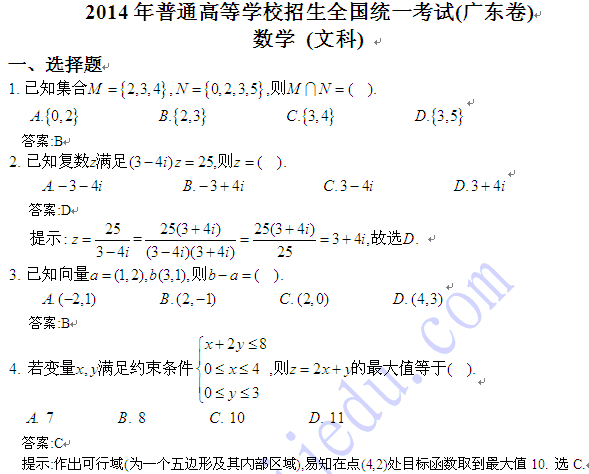 ——>>数学——>>高考(广东页面)——>>2014年广东高考数学(文科)试题及答案解析word版站