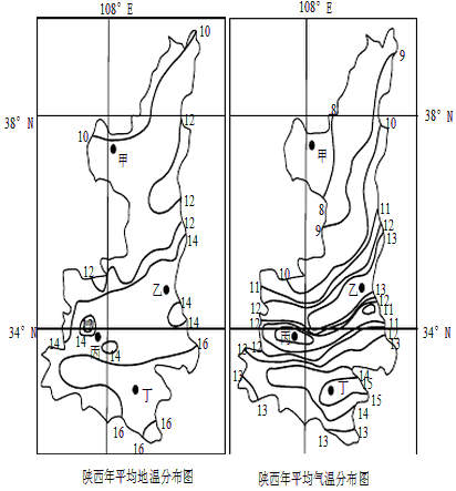 读陕西省年平均地温和气温分布图。完成9~10题。