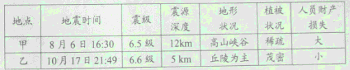 (3)甲地损失比乙地大,主要是由于甲地的地震引发了 灾害,此灾害是如何形成的?请利用表中两条信息加以说明。(8分)