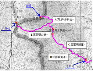 第二天:豪宅 → 云蒙山主峰 → 万岁杨 →莲花瀑→云蒙峡 → 对家河,路程大概21公里,时间9-10小时。从豪宅往北到达云蒙山主峰,路上有岔道,小心迷路。莲花瀑夏季十分壮观,但瀑布两旁道路很滑,可用安全绳帮助下行。云蒙峡是一条有水的河谷,前方有断崖,偶有落石,土路在此完全消失,只能靠在谷中的石头上蹦跳前行。营地可选在对家河,也可根据同行人员的多少灵活选择在万岁杨至对家河之间的地面扎营,附近都有水源补充。