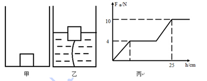 一个边长为10cm的立方体木块,细线的一端跟木块底部相连,另一端固定在容器底如图甲所示(容器高比细线与木块边长之和大得多),现向容器中慢慢加水,如图乙所示。用F浮表示木块受到的浮力,用h表示容器中水的深度.则图丙可以正确描述F浮随深度h变化的关系图象。(g取10N/kg)
