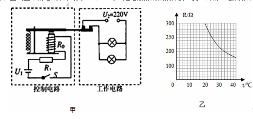 某同学利用热敏电阻为家中灯暖型“浴霸”(用电灯取暖的用电器)设计了一个温度可自动控制的装置,如图甲所示。“控制电路”中的热敏电阻R1的阻值随温度变化的曲线如图乙所示.电磁铁线圈可看成阻值为20Ω的纯电阻R0,“浴霸”共安装有2盏标有“220V,440W”的灯泡,当电磁铁线圈中电流大于或等于50mA时,继电器的衔铁被吸合,使“浴霸”电路断开;当线圈中的电流小于或等于40mA时,继电器的衔铁被释放,使“浴霸”电路闭合。