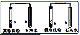 实验一:分别取真假珍珠粉适量置于两支试管中,加
