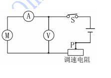 某电动自行车简化电路图如图所示,电压保持不变,调速电阻的最大阻值为10Ω。闭合开关S,当调速电阻的滑片P滑到最左端时车速最大,此时电流表示数为5A,电动机的电功率为180W;当调速电阻的滑片P滑到最右端时车速最小,此时电流表示数为1A。求: