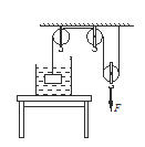 (10分)如图所示,水平桌面上放一底面积为100cm2的柱形容器,容器内盛有某种液体,滑轮组左端挂一重物,并浸没在液体中,当物体浸没在液体中平衡时,需在动滑轮上施加一竖直向下11.6N的作用力F.当将物体上提到恰好有一半体积露出液面平衡时,施加在动滑轮上作用力F变为12.8N。已知物体的密度为5.0×103kg/m3,每个滑轮的重力均为1.0N,忽略绳重、轮与轴之间的摩擦。取g=10N/kg,求: