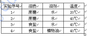 为了探究影响物质溶解性的因素,设计 了如右表所示的实验方案。该实验 无法探 究的因素是 A.溶质种类